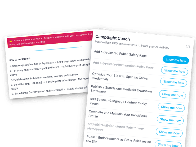 CampSight Coach analyzes the totality of what AI says about you, compares it to your actual platform comms, then hands you a ranked punch list of actions you can take to shape the narrative. Every recommendation is specific, prioritized by impact, and designed to close the gap between what you stand for and what AI tells voters. CampSight tracks when the changes you make start showing up in AI answers so you can measure the impact.