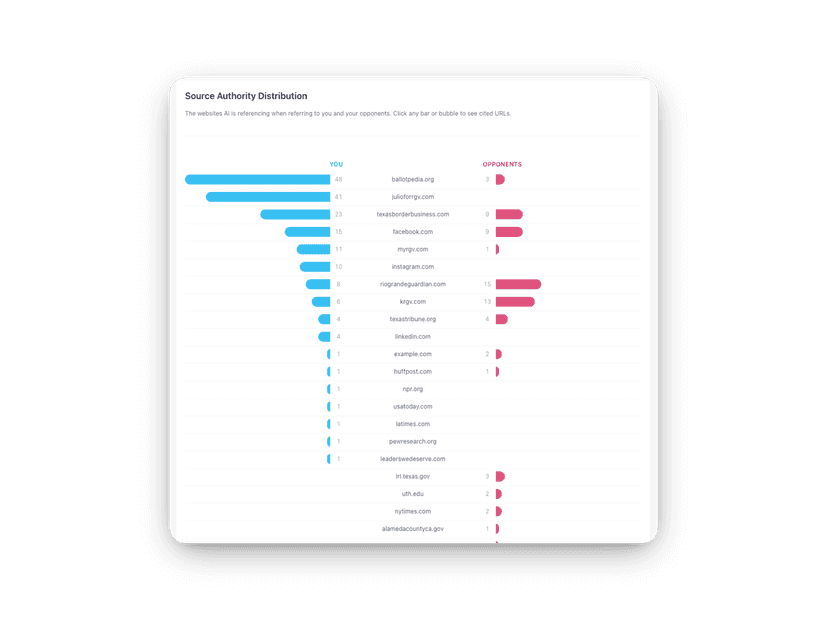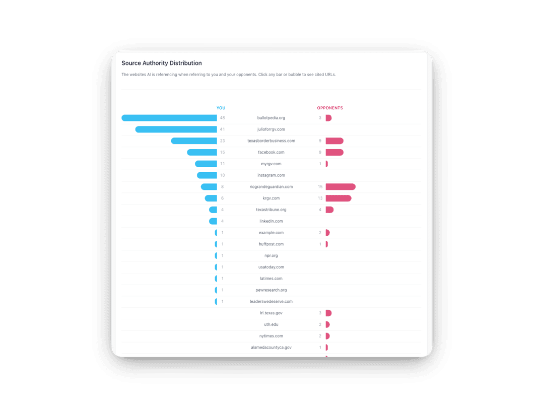 AI chatbots don't make things up from nowhere (most of the time) — they cite specific websites. CampSight reveals every source shaping your AI narrative, from local news outlets to advocacy scorecards. See who's helping you, who's hurting you, and where the information feeding new answers is coming from.